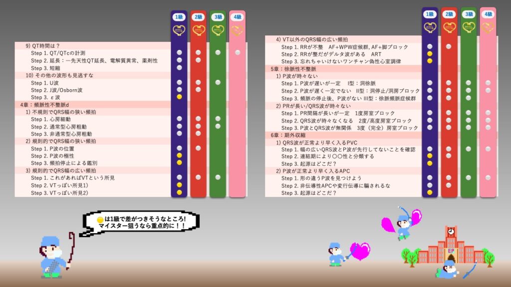 不整脈の起源推定・複雑な鑑別・電気生理学的な深い理解が求められ、2級の知識を確実に固めた上で、さらに上のレベルへ踏み込む必要があります。
