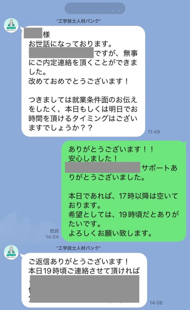 私の担当者も対応がとても丁寧で、連絡もスムーズでした。LINEでやり取りができるため気軽に相談でき、仕事をしながらでも無理なく転職活動を進められました。さらに、私は他のエージェントサイトも登録していましたが、工学技士人材バンクの担当者が最も対応が良かったです。