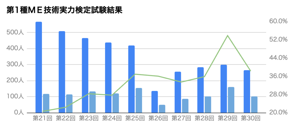 新制度以降のME1種は、正しい対策を積み重ねれば学生でも合格できる試験です!実際、第29回(2024年)の合格率は53.8%と、過去最高を記録しています。